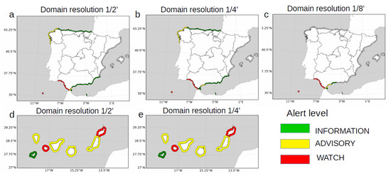 Maximum heights obtained at different resolutions differ at some FCPs, and the differences are about 10−1 m (Figure S1). However, these differences are large enough to increase the tsunami alert level in some coastal regions (Figure 8). The alert level is computed for specific warning segments along the Spanish coast based on the largest maximum height of the FCPs belonging to each segment. In this study, the maximum height at each FCPs was computed as the 90th percentile of the maximum height from the 135 scenarios. Tsunami warning level results (Figure 8) show few changes in alert levels when increasing the resolution of the computational domain. They change only in two warning segments close to the strait that separates the Iberian peninsula and Africa (Figure 2), in the westernmost part of the Mediterranean. One segment changes level from INFORMATION to ADVISORY, while another segment changes level from ADVISORY to INFORMATION when domain resolution is refined from ½ arcmin to ¼ arcmin, and both segments stay at ADVISORY when the resolution domain is refined to ⅛ arcmin. These small variations in the maximum height and, therefore, in the tsunami alert level, might be in part due to the resolution of computational domains playing an important role because of the narrow distance between coasts (e.g., at Gibraltar Strait ) and the shallow and heterogeneous bathymetry in the area (Figure 1). Tsunami alert levels maintain the same levels at the rest of the segments in the Iberian peninsula and the Canary Islands when the domain resolution is refined from ½ arcmin to ¼ arcmin and to ⅛ arcmin.