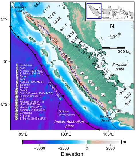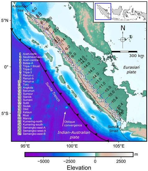 - McCaffrey, R. The Tectonic Framework of the Sumatran Subduction Zone. Annu. Rev. Earth Planet. Sci. 2009, 37, 345–366. [Google Scholar] [CrossRef]