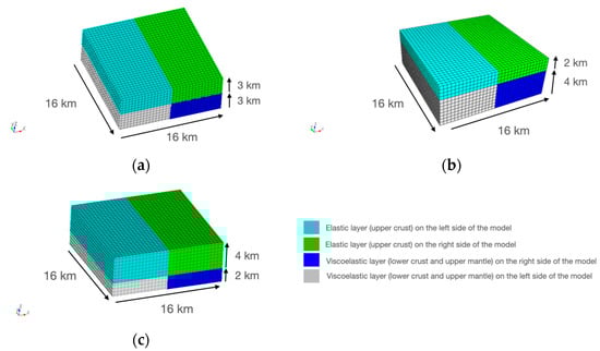 Numerical mesh of the finite element model using three different scenarios: (a) an equal thickness of 3 km for the elastic upper crust (upper mesh layer) and the viscoelastic lower crust and upper mantle (lower mesh layer) as scenario one; (b) a thinner elastic upper crust layer (2 km) than the viscoelastic layer (4 km) as scenario two; and (c) a thicker elastic upper crust layer (4 km) than the viscoelastic layer (2 km) as scenario three.