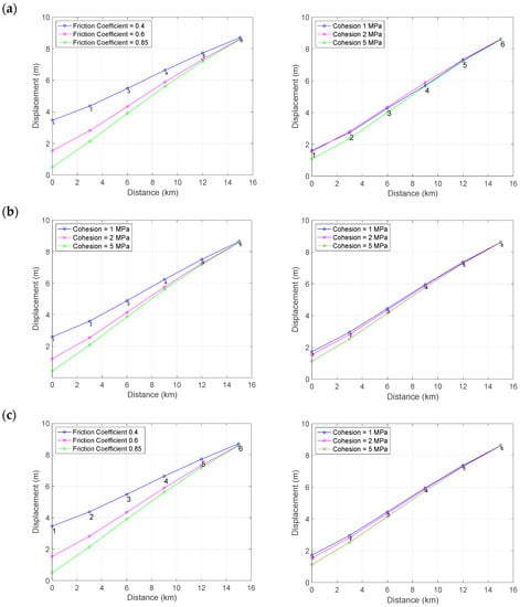 Displacement with distance from the fault of strain buildup model at year 250 based on different friction coefficients and cohesion values in three scenarios: (a) scenario one, (b) scenario two, and (c) scenario three.