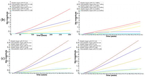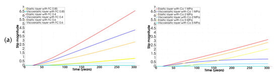 Afterwards, slips along the fault are also estimated for the different scenarios applied in this simulation. As expected, applying a larger friction coefficient and cohesion value will result in a smaller slip in both the elastic and viscoelastic layers (see Figure 5). Furthermore, we found that the thicker the viscoelastic layer (scenario two), the smaller the slip along the fault (Figure 5b). Compared to the cohesion, the impact of the friction coefficients on the displacement on the surface was greater. The reduction in the displacement on the fault caused by the higher friction coefficient of 0.85 was found at ~0.9134 cm. It is almost three times higher than the displacement reduction caused by the higher cohesion value of 5 MPa (~0.3238 cm).