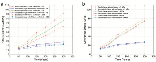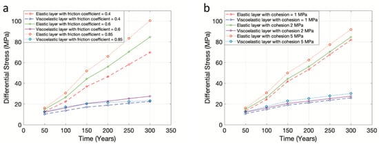 Differential stress at the center of each layer of strain buildup model based on (a) different friction coefficients and (b) different cohesion levels.