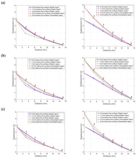 Displacement with the distance of strain release model with slip of 7.575 m in three scenarios (left) at 505 years and (right) at 750 years for (a) scenario one, (b) scenario two, and (c) scenario three.