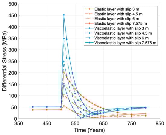 The viscoelastic material in the strain release model was also simulated for four different earthquake slip magnitudes, i.e., 3 m, 4.5 m, 6 m, and 7.575 m. Figure 9 shows the differential stress at the boundary of each layer. A greater earthquake slip magnitude results in a greater differential stress (Figure 9). Each slip that increases by 1.5 m results in increasing the differential elasticity by ~48.566 MPa in that elastic layer and by ~99.677 MPa in the viscoelastic layer.
