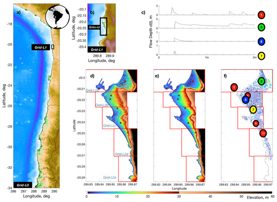 The inundating flows were estimated using the numerical NLSWE model Tsunami-HySEA, which has been benchmarked and validated in accordance with U.S. National Tsunami Hazard Mitigation Program (NTHMP) [35,36], as well as for currents [37]. Up to four sets of nested grids, with varying spatial resolutions, were built from the freely available General Bathymetric Chart of the Oceans [38] and nautical charts elaborated by the Hydrographic and Oceanographic Service of the Chilean Navy (SHOA). Inland topography was determined from LiDAR flights that allowed for the construction of DSM and DTM surfaces (Figure 1). Three nesting schemes were tested in order to assess the effect on the final inundation map of the nesting scheme. The outermost and coarsest layer was built from GEBCO data using a resolution of 30 arcsec (roughly 900 m). Two telescopic levels were used, which were defined by the ratio between the parent and child grids. Ratios of 4 and 8 were used, using three configurations as shown in Table 1, which allowed for a maximum grid resolution of 3.51 m per side. Figure 1 shows the extent of each of the Cartesian numerical domains. In the latest grid level, streets and buildings were included for the baseline DSM model, assuming that buildings were fully resistant to the incoming flows, and remained in place during the modeling of the reference simulation (Figure 1d), whereas, in all others, the bare surface was retained (Figure 1e). Buildings were assumed to be taller than the maximum flow depth; hence, they are never covered by the flow for this reference scenario. For the other cases, buildings were removed while streets retained the elevation leading to DTM cases, as shown in (Figure 1f). This allowed for the comparison between DSM, and DTM-CRM results, as the version of Tsunami-HySEA tested did not allow for a VRM.