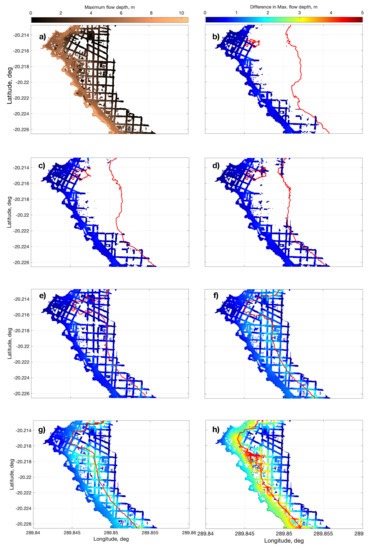 Figure 2b–h show a comparison between the DSM and DTM-CRM models at the largest resolution. For brevity, sample Manning n values are indicated, which capture the trend in the results. The maps show the difference among extrema