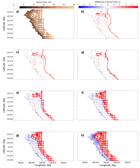 Figure 3a shows the arrival time, as computed by Tsunami-HySEA as the first instance of non-zero flow depth. Figure 3b–h show the differences among these reference values, and those estimated by the DTM-CRM models at maximum resolution
