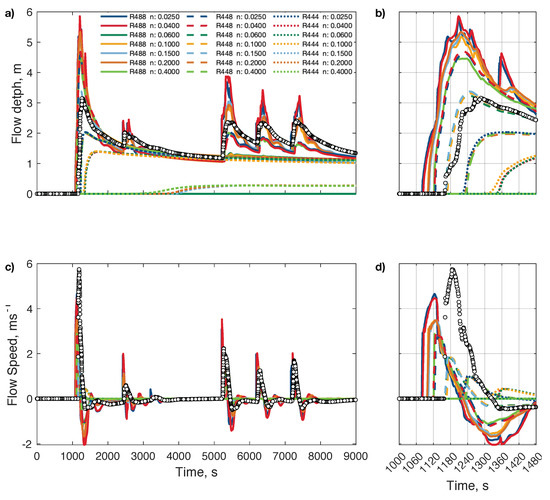 Time series of flow depth (a,b) and velocity (c,d) at inland gauge 3, for all resolutions (line types) and a range of Manning n values (colors). Circles are the reference model. Panels (b,d) are zoomed in near the first arrival.