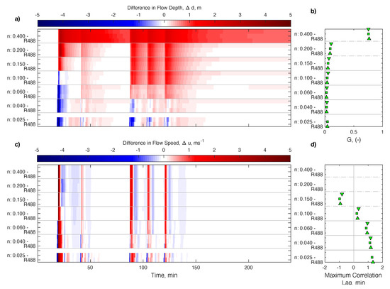 and plotted as maps in Figure 5a,c for the flow depth and velocity, respectively. The ordinate axis is time, and the abscissa is ordered by increasing the Manning n value. For each Manning n value, the three different ratios are presented. Warm colors denote positive , and thus DTM-CRM under prediction. Figure 5a shows that, as the n value increases, there is a transition of the arrival time that gets gradually delayed. However, this effect is relatively small, with maximum differences of approximately two minutes between models. Thus the effect of changing resolutions is small on arrival times. The error in the arrival of the leading wave becomes minimal for . However, matching the arrival time comes at the expense of significantly altering the remainder of the time series. While, for some cases the presence of several waves can be identified, as the Manning n value increases, the modeled flow omits the trailing waves present in the DTM-CRM results, which explains the increase in errors for times exceeding 90 min. Velocity differences follow a similar pattern, but with stronger discrepancies near crests and troughs that are indicative of transitioning from early to late arrivals as the Manning n value increases.