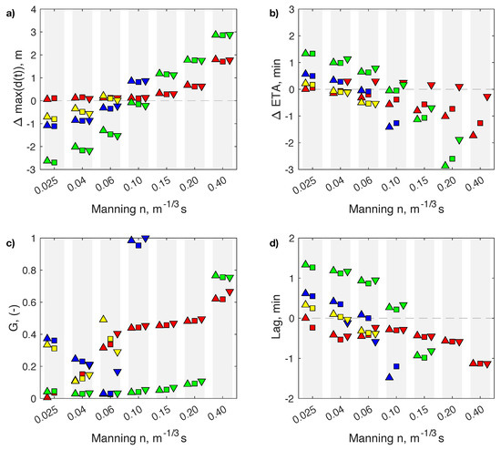 Summary statistics for all inland gauges, as function of Manning n values. (a) Maximum difference in flow depth; (b) Difference in arrival time; (c) G parameter; and (d) Estimated time lag. Red, green, blue, and yellow markers denote inland gauges 1, 3, 5, and 7, respectively. Symbols also denote the resolution: ∆, □, ▽.
