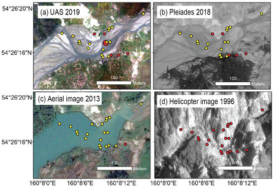 Comparison of the remote sensing images acquired over the 20 years (1996–2019) shows the profound changes in the area. In the 1996 helicopter image data, a deep valley with the presence of a group of small geysers and thermal spots called Malaya Pechka (Small Stove) (Figure 3a) is visible. After the 2007 landslide and river dam, a lake covered this group and other geysers (Figure 3b), with an estimated 20 thermal spots being covered by sediment and water. Malaya Pechka was not visible in the Pleiades satellite data, nor in the optical and thermal data acquired by our drone in 2018 and by aerial photography in 2014 (Figure 5). The drone data confirm that the sedimentary terraces have developed in the riverbed do not show the visual characteristics of hidden geysers or thermal features.