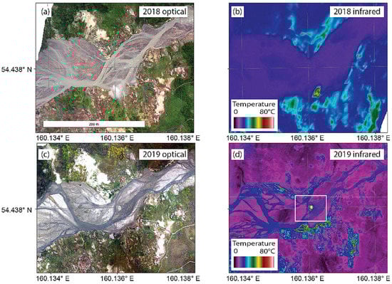 UAS orthomosaic results showing (a) the optical view from 2018, (b) the thermal infrared map from 2018, (c) the optical view from 2019, and (d) the thermal infrared map from 2019. Note the changing streamlet locations in the optical orthomosaic and the changing temperature anomalies and new vent location in infrared orthomosaic. Different colorization results from different optical conditions (sun location, month) and from different flight heights above the ground (brightness temperature effect by infrared pixel size). The white box in (d) shows the close-up view depicted in figures below.