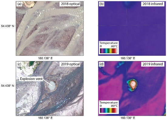 UAS orthomosaic results showing (a) the 2018 optical view, (b) the 2018 thermal infrared map, (c) the 2019 optical view, and (d) the 2019 thermal infrared map. Note the changing streamlet locations in the optical orthomosaic, and the changing temperature anomalies and new vent location in the infrared orthomosaic. Different colouring results from different optical conditions (sun position, month) and from different flight altitudes (temperature brightness shown per infrared pixel size).