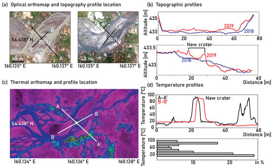 Optical and thermal maps and profile views. (a) Optical orthomap generated before and after the explosion. Black lines indicate profile lines in (c). (b) Thermal orthomap, with white lines indicating profile lines in (d). (c) Profiles through topographic data from the 2018 and 2019 datasets show widespread sediment accumulation (~0.3 m on average) and the new crater location, expressed by a 0.2 m high crater rim. (d) Profiles through the temperature map show the pronounced thermal expression of the new crater, reaching 94 °C in 2019, clearly different from the surrounding temperatures, which are <20 °C on average. Profile A-A′ shows the maximum temperature compared to Bolshoy Geyser to the south. The profile along the river (B-B′) indicates downstream cooling.