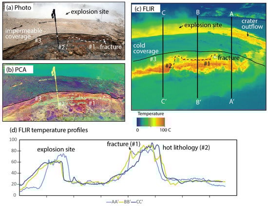 Finally, we re-examined the ground-based field photographs, which provided a better understanding of the causes of the high thermal contrasts seen in the nadir drone data. A field image taken from the excavated rim of the explosion crater shows a highly stratified sedimentary sequence, with brownish to dark greyish layers at the centimetre and decimetre scales (Figure 7a). To better visualise these subtle colour contrasts, we performed the PCA in Figure 7b, which shows a sharp transition between the layers and local near-surface fractures. This PCA view can be compared to a handheld FLIR thermal infrared image, showing that the mid-grey layer is the one with high brightness temperatures (in fact, close to boiling), while the brownish layers are quite cold. This is further highlighted in the temperature profiles which show the thermally constricted anomalies, suggesting a strong lithological control on the boiling water reservoirs. It can be speculated that the sealing of these boiling water reservoirs, together with the unloading and temperature rise, may culminate in a geothermal explosion, as discussed below.