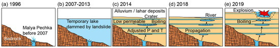 Based on the observations made and presented in this paper, we developed a conceptual model summarised in Figure 9. In 1996, the Malaya Pechka was a small site of periodic fluid discharge in a steep V-shaped river valley (Figure 9a). It produced a series of small outflows of boiling water and steam. After the large landslide in 2007, the geyser site was hidden under a temporary lake at a depth of about 10 m (Figure 9b). In 2014, the rapid erosion of the dam began and the valley became a major sediment accumulation site during periods of intense rainfall and snowmelt. Correspondingly, the formerly V-shaped valley changed its morphology to develop a flat riverbed composed of alternating coarse and fine-grained fluvially redeposited clastic material up to 20 m thick [22]. Drone data acquired in 2018 show no evidence of thermal water discharge, and no craters are visible. We speculate that the succession of erosion and accumulation resulted in alternating permeability structures (Figure 9d). As sedimentary layers accumulated as 20 m-thick deposits on top of the original Malaya Pechka, the vent was deeply buried under an estimated 780 tonnes of gravel and clay (5 m diameter and 20 m high sediment) [36], equivalent to ~200 kPa hydrostatic pressure or ~400 kPa lithostatic pressure (assuming a bulk density of the sediment of 2000 kg/m3). Two processes may then have occurred: first, a gradual heating of the covered deposits from below, and/or second, a gradual lowering of the sedimentary cover or groundwater table associated with the gradual erosion of the dam composed of 2014 landslide deposits. Gradual upward heating may occur by conduction or fluid rise through the permeable space in the coarse-grained layers, creating small layers of hot geothermal fluids. If impermeable layers prevent further heat transfer, the water could reach boiling point and an explosion could occur (scenario (1) in Figure 10). We speculate that a number of new pockets of thermal water have accumulated within the sediment, and the boiling point is re-established at a shallower depth. Alternatively (or in addition), lowering of the overburden may have caused pockets of thermal water to become oversaturated with steam, leading to an explosion (scenario (2) in Figure 10). The interplay between overburden pressure and heating to the boiling point is therefore critical to understanding how the water reached the boiling point (Figure 10) and expanded rapidly, triggering the geothermal explosion.
