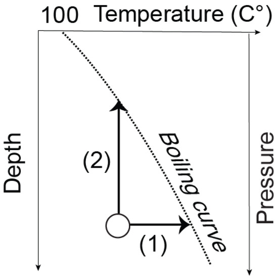 Scenarios for how a pocket of heated geothermal fluid reaches the water boiling point, namely by ascent (1) and by heating (2). See text for details.
