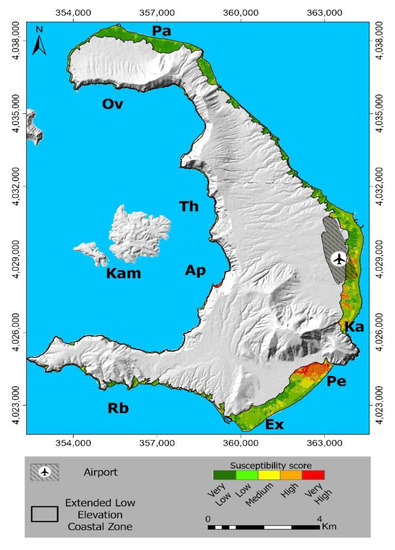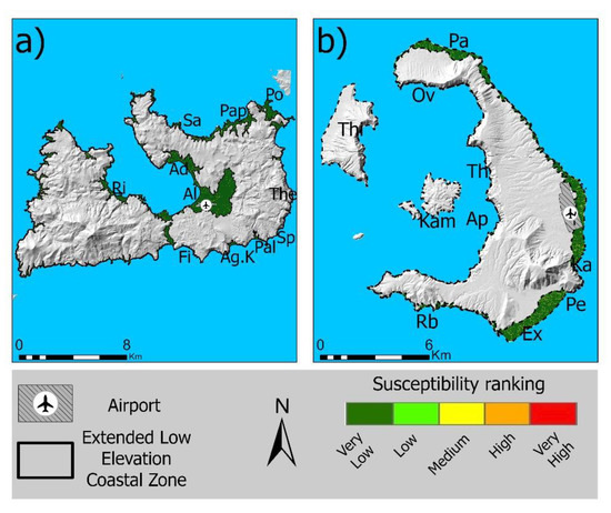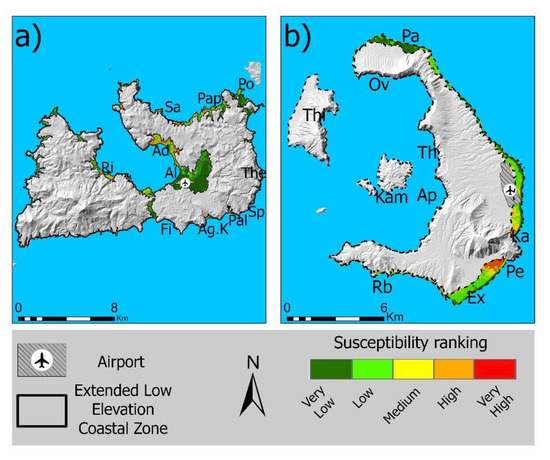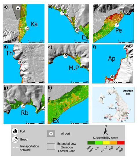 According to the report of the Intergovernmental Panel on Climate Change (IPCC), [5] the Aegean Sea will be one of the most vulnerable areas in the Mediterranean basin to global warming and climate change scenarios, with more extreme meteorological events, heat waves and droughts. The resilience of coastal infrastructure and topography are key parameters in mitigating susceptibility to torrential floods, landslides, tsunamis, and Sea Level Rise (SLR) [6]. According to Krassakis, et al. [7], low-lying areas, in terms of the Extended Low Elevation Coastal Zone (ELECZ), require holistic coastal planning, due to their high urbanization expansion and soil loss.