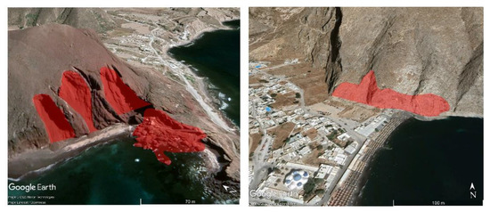 Historically, Thira and Milos have suffered frequently from landslide events, causing serious damage along transportation networks, seaports, pathways and beaches near to cliffs. According to the records, landslides and/or extreme rainfall events have occurred in Thira Island, in Oia, 2011, Fira, 2022, Red beach, 2018, etc., and in Milos Island, in 1992 Palaiochori and Firiplaka, and in 2017 Papafragas beach. In addition, intense weather fronts named ‘Eva’, ‘Elpida’ ‘Ballos’ etc., have become more frequent in Greece and by extension in the Cyclades, putting lives and infrastructure in danger. Therefore, soil loss and erosion need to be monitored frequently, especially due to the unplanned urbanization expansion adjacent to the existing drainage networks and coastal cliffs, which are connected with steep and increasing slopes and terrain [30,31,32,33].
