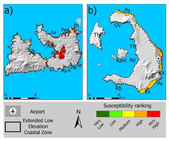 Coastal environments are highly recognized for their spectacular morphological features and economic activities, such as agriculture, maritime traffic, fishing, and tourism. In the context of climate change and the evolution of physical processes, the occurrence of intense natural phenomena adjacent to populated coastal areas may result in natural hazards, causing human and/or structural losses. As an outcome, scientific interest in researching and assessing multi-hazard susceptibility techniques has increased rapidly in an effort to better understand spatial patterns that are threatening coastal exposed elements, with or without temporal coincidence. The islands of Milos and Thira (Santorini Island) in Greece are prone to natural hazards due to their unique volcano-tectonic setting, the high number of tourist visits annually, and the unplanned expansion of urban fabric within the boundaries of the low-lying coastal zone. The main goal of this research is to analyze the onshore coastal terrain’s susceptibility to natural hazards, identifying regions that are vulnerable to soil erosion, torrential flooding, landslides and tsunamis. Therefore, the objective of this work is the development of a multi-hazard approach to the South Aegean Volcanic Arc (SAVA) islands, integrating them into a superimposed susceptibility map utilizing Multi-Criteria Decision-Making (MCDM) analysis. The illustrated geospatial workflow introduces a promising multi-hazard tool that can be implemented in low-lying coastal regions globally, regardless of their morphometric and manmade characteristics. Consequently, findings indicated that more than 30% of built-up areas, 20% of the transportation network, and 50% of seaports are within the high and very high susceptible zones, in terms of the Extended Low Elevation Coastal Zone (ELECZ). Coastal managers and decision-makers must develop a strategic plan in order to minimize potential economic and natural losses, private property damage, and tourism infrastructure degradation from potential inundation and erosion occurrences, which are likely to increase in the foreseeable future.