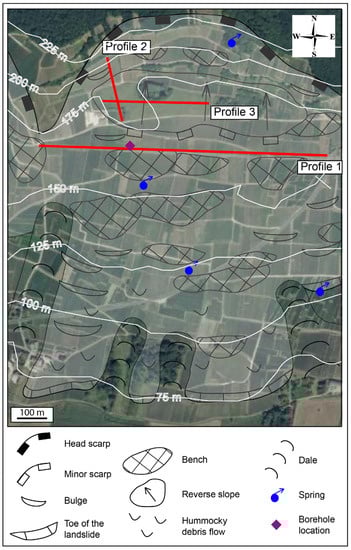 First, following Guérémy and Marre [19] and Moeyersons et al. [20], a large scale geomorphological map of the Jacotines landslide (1/10,000) was produced to delimit surface morphology and to localize springs. The internal structure of the landslide was then investigated using geophysical methods. On the one hand seismic refraction tomography data (profiles 1, 2 and 3 on Figure 3) can provide structural information [21,22,23,24]. On the other hand electrical resistivity tomography data (profile 3, dipole-dipole and Wenner-Schlumberger methods) can provide information on water content [25,26,27,28,29,30,31,32,33,34]. The two methods are also complementary since the seismic data are more reliable in depth while the electrical data give more accurate results near the surface [23]. Measurements were made on the Jacotines landslide along three profiles: two transverse to hillslope direction (profiles 1 and 3, 950 m long and 350 m long respectively) and one longitudinal to hillslope direction (profile 2, 250 m long; Figure 3). Seismic investigations were performed along the three profiles and electrical investigations were performed on profile 1. The pattern of the vineyard plots together with the narrowness of the agricultural paths prevented the realization of a complete longitudinal profile from top to bottom of the landslide.