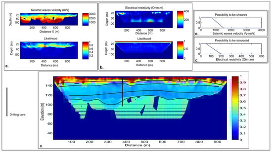 Data fusion was finally used to verify and interpret the similarities between seismic and resistivity data as a result of water-saturation and shear characteristics of the material. Given the inherent uncertainty of the method [39] the fusion integrates the likelihood distribution in order to check the reliability of each kind of data, i.e., Vp and ρ (Figure 7a,b). The likelihood functions show that the seismic data are not sufficiently accurate in the first 20 m and beyond a depth of 60 m (Figure 7a), where the density of seismic ray is insufficient. Conversely, electrical data are most reliable near the surface (Figure 7b), as shown by the computation of a sensitivity matrix. Thus, the combination of seismic and resistivity tomograms gives reliable results up to a depth of 60 m. The conversion from geophysical parameters to ground properties is based on the determination of belonging functions (Figure 7c,d). This determination was done by comparing the inverted resistivity and velocity values at the surface with what we observed on the field in terms of rock saturation and fissuring. In the Jacotines landslide case, wave velocities lower than 700 m/s indicate on the field disturbed material due to shearing or surface weathering, while values greater than 1500 m/s indicate sound material (Figure 7c) [40]. Concerning resistivity, when the ρ values are less than 50 Ohm.m, the material is observed as saturated, whereas above 200 Ohm.m it appears as rather dry (Figure 7d). Below and beyond these limits the rock can be considered as fissured/saturated and sound and dry respectively. Between them, we can extrapolate linearly intermediate behaviors, more or less disturbed and saturated. These functions are then used to convert tomogram values in terms of possibility—between 0 and 1—to get a fissured or saturated material representations. As described by Grandjean et al. [39], the fusion is then operated by using fuzzy operator theory in which we use the sup() function to take the maximal value of the two possibility sections (Figure 7a,b up) after we modulate them by the likelihood (Figure 7a,b down) related to the inversion uncertainties. Finally, data fusion (Figure 7e) allows to check whether the hypothesis of a water-saturated ground or of a sheared material is true (= 1) or false (= 0).