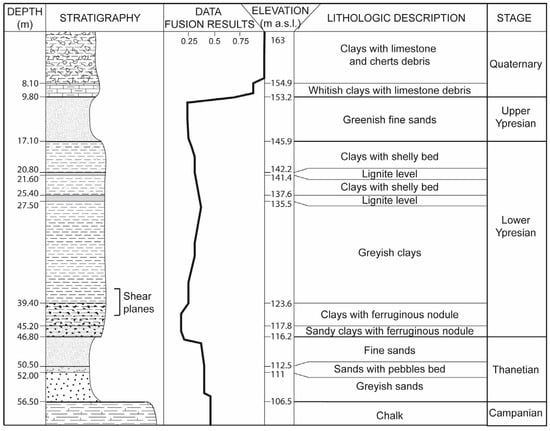 The comparison of the drilling core lithostratigraphy with the data of the geological map and other bibliographic references for this area shows that all the cenozoïc strata are found in their normal succession, although the boundary between the Thanetian and the Ypresian formations and the one between the Lower Ypresian and the Upper Ypresian formations are difficult to determine here. Moreover, the Lower Ypresian formation is 28 m thick in the borehole, while its maximum thickness is normally 25 m [41]. Conversely, the thickness of the Upper Ypresian, 7 m, seems a little weak. The five shear planes that follow one another between a depth of 37.5 m and 42 m might explain these thickness anomalies (Figure 8). The combination of the drilling core description and the geophysical data makes it possible to define the different elements of the data fusion tomogram. The discontinuities identified through geophysics (Figure 7e) are clearly associated with facies changes (Figure 8) and can be extrapolated to the entire profile.