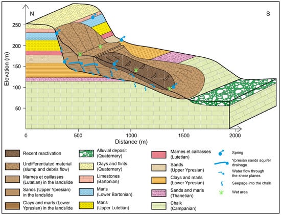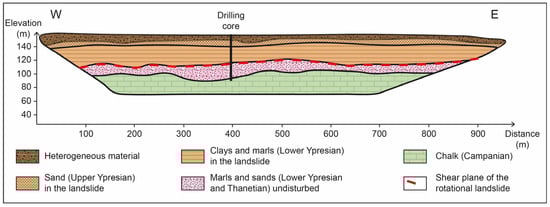 Surface landform analysis, borehole data and geophysical investigations allow to determine the thickness of the landslide. The geological layers located below a depth of 40 m, between elevations of 110 and 120 m a.s.l., are undisturbed. From bottom to top, the Cretaceous chalk is overlain by the sandy formations of the Thanetian and of the Lower Ypresian. The five shear planes observed in Lower Ypresian clays at about a 40 m depth correspond to the sliding surface of the Jacotines landslide. Over these shear planes all the layers are displaced and correspond to the landslide affected strata. Within the displaced body the Ypresian formations retain their original stratigraphy. On the contrary, the heterogeneous material present in the first 10 upper meters consists of a disorganized blend of strata (clays of the Lower Ypresian, sand of the Upper Ypresian, “Marnes et caillasses” of the Lutetian; Figure 10) which outcrop higher on the hillslope. It results from a recent debris flow superimposed on the rotational landslide.
