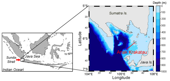 - Deplus, C.; Bonvalot, S.; Dahrin, D.; Diament, M.; Harjono, H.; Dubois, J. Inner structure of the Krakatau volcanic complex (Indonesia) from gravity and bathymetry data. J. Volcanol. Geotherm. Res. 1995, 64, 23–52. [Google Scholar] [CrossRef]