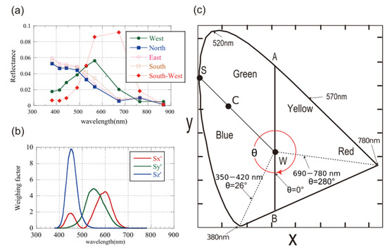 Since the variables x, y, and z in these equations have a relationship of “x + y + z = 1”, z is not necessary for the scene that essentially expresses color. Therefore, in principle, if only R (λ) of 380 nm to 780 nm is known (commonly included in Equations (1)–(3)), the remaining coefficients can be obtained by using constants such as the Japanese Industrial Standards Handbook [22]. Thus, the sea color can be quantified by two numerical values: x and y. However, for S (λ), the standard light near the solar light source called D65 defined by CIE is used to determine the standard sea color in the field. Figure 2a,b shows the wavelength characteristics of the weighting factor [22], which is the “product of the color matching function and the standard light D65” used in Equations (2)–(4).