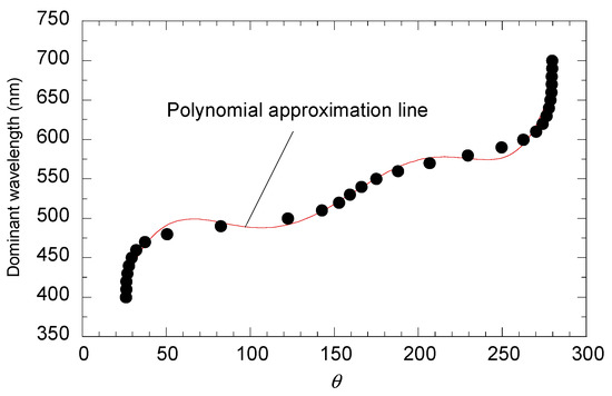 The x and y values obtained in this way are shown in the chromaticity coordinates shown in Figure 2c. The outer circumference of this chromaticity coordinate (the numerical value of the wavelength written on the thick black curve) corresponds to the dominant wavelength. For example, when the coordinates (x, y) of C are obtained, the dominant wavelengths are the white point W (x = 0.3333, y = 0.3333) and the point S where the extension line of C and the outer circumference intersect. The “ratio of WS and WC ([WC/WS] × 100%)” is called “purity”, and the closer it is to S, the higher the purity of the color (the purity of the S point is represented by 100%). Generally, the dominant wavelength is determined by drawing, but the numerical calculation is not open to the public. Therefore, point B, where the perpendicular line is drawn from point W and intersects with the outer circumference, is set to 0°, and the clockwise 360° is set to θ [23]. Then, a polynomial approximation is performed on the relationship between θ and the dominant wavelength obtained from the known dominant wavelength coordinates [24], as shown in Figure 3 and Appendix A, Table A1. An equation for obtaining the dominant wavelength (symbol: DWL) is created from θ. The obtained sixth-order approximation expression (R2 = 0.98) is shown in Equation (7).