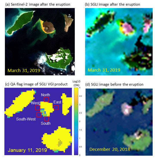 Comparison of the satellite data used. The Sentinel-2 image (a) was acquired on the same day as the SGLI image (b) (31 March 2019), QA flag image (c) of the SGLI VGI product, and the SGLI image (d) before the eruption. The square surrounded by red in Figure 3c is the discolored seawater area where the chromaticity judgment of SGLI was performed.