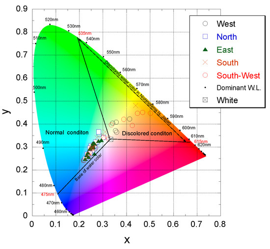 The color system used this time is the XYZ color system [14] adopted in 1931 by the International Commission on Illumination (CIE), which has a proven track record in the color evaluation of crater lakes and hot springs [12,13]. Although it is possible to specify an objective and accurate color by expressing it with the two numerical values (x, y) obtained by this color system, it is not easy to associate the color with the two numbers. Furthermore, there is the advantage that it is easier to explain the characteristics of discolored seawater by showing the two numbers in the image as one number (the dominant wavelength) rather than showing them separately in the image.