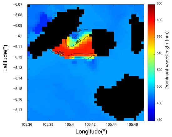 In Section 3.1, the dominant wavelength characteristics of the partially discolored-water area near Anak Krakatau were shown. Next, we calculated the dominant wavelength distribution for each day and evaluated the distribution area quantitatively. Figure 6 is an example of the dominant wavelength distribution map calculated using SGLI data (as of 8 January 2019). This figure is roughly divided into a blue region (background water), a red region showing a relatively long dominant wavelength, and a green-to-yellow region located between blue and red. As shown in Figure 6, the boundaries of these regions almost coincided with the 500 nm and 560 nm contour lines. Figure 7 shows the results of applying the same treatment to the SGLI data 10 days after the eruption. Each day is represented by RGB color images (left) and a dominant wavelength image (right). From this, the data of each period are mainly divided into three color regions (Figure 6), and the water area indicated by the red boundary line of 560 nm is clearly detectable. However, the data on February 11 showed a highly complex pattern. Since such a peculiar pattern may significantly influence (error) the interpretation when quantifying the color change range, a more stable quantification of discolored water is needed.