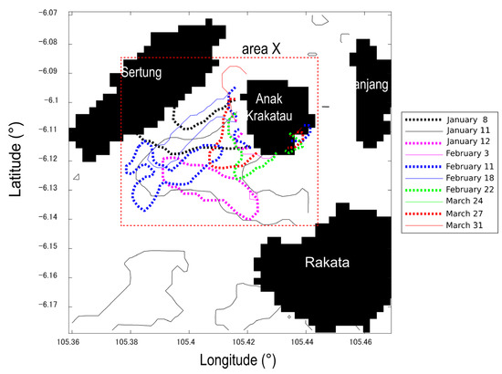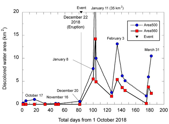 As explained in Section 3.2, it can be easier to analyze the spatial change of discolored water in one image by extracting the contour line of 500 nm or 560 nm. Here, all the contour lines of discolored seawater with a dominant wavelength of 560 nm or more (hereafter referred to as the “yellow region”) are shown in Figure 8. In the water area near Anak Krakatau (area X in the figure), the distribution of the yellow area is expanded or contracted at almost the same position. As shown in Figure 8, the discolored-water area extending from the island to the south-west can be read as about 0.03° and 0.04° in the latitudinal and longitudinal directions, respectively. Assuming that the distance of 1° is about 111 km, it is estimated that the yellow region extended to approximately 5.6 km in the south-west direction. At the end of March, we could qualitatively read that this yellow area was shrinking. Therefore, to quantitatively express the size of the yellow region, changes in the size of the yellow region were investigated only in area X. Figure 9 shows the relationship between the total data from April 2018 to March 2019 and the areas more than 500 nm and more than 560 nm. These areas shown here were calculated by multiplying the number of pixels in these regions by the square of the spatial resolution of SGLI (250 m). As a result, the size of these regions changed in a complicated manner within the range of 0 to 35 km2. Immediately after the eruptive activity on 22 December 2018, the area of discolored water expanded rapidly. In addition, the fact that the area of the dominant wavelength of 500 nm or more slightly increased just before this eruption is noteworthy from the viewpoint of eruption forecasting.
