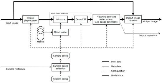 Once the algorithm finishes processing the input image, it provides the option to render an output image, with water mask and level gauge images overlaid on the original input image (blue area in Figure 2). The output metadata contain the exit status of the processing pipeline (success or error code), summarized information about the measured water levels and the location of the output image. System configuration is obtained from a configuration file which, in turn, is split into two main sections: general configuration of the system and configuration of camera-specific sections. The general section contains system settings, which are common for all cameras. The camera-specific sections concern factors that are specific to each camera, like information on water level gauges, their positions, etc. The camera section was selected based on the metadata associated with the input image, and its configuration was merged with the configuration defined by the general section, overriding the defaults. Such structure eliminates duplication of configuration sections common for all cameras (like colors, the location of the file containing model weights, etc.), while allowing for the full customization of camera-specific parameters, including the use of fine-tuned models.