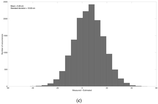 In Figure 4, we show the images obtained from the algorithm for the second selected site under two distinct illumination conditions; in the first case (Figure 4a), the image was collected under cloudy skies conditions and when rain was falling. In the other case (Figure 4b), the image was acquired under sunny conditions. Our results show that our algorithm can provide accurate estimates of water levels under both conditions. The skills of the algorithm to replicate gauge data are indicated by the high coefficient of determination (R2 = 0.95) and by the value of the slope (0.980) and bias (−0.113 cm, Figure 5b). When applied to the total number of images, we obtained the following statistics: R2 = 0.84, slope = 1.103 and bias = 3.04 cm. In the case of this gauge, images from web cameras were not available at all so it was not possible to assess the potential skills of the algorithm at night. As performed with the previous gauge, we also computed the histogram of the difference between the gauge-measured and camera-estimated water levels (Figure 5c) and found a mean difference of 5.35 cm and a standard deviation of 12.03 cm. Moreover, we computed the mean and standard deviation of the differences for the morning, afternoon and night and obtained 4.32 ± 11.76 cm (00:00–08:00), 3.78 ± 9.64 cm (08:00–16:00) and 7.28 ± 13.08 cm (16:00–24:00), respectively. These results, consistent with the ones obtained for the other gauge, indicate that the performance of the algorithm degrades during nighttime and is best in the afternoon period.