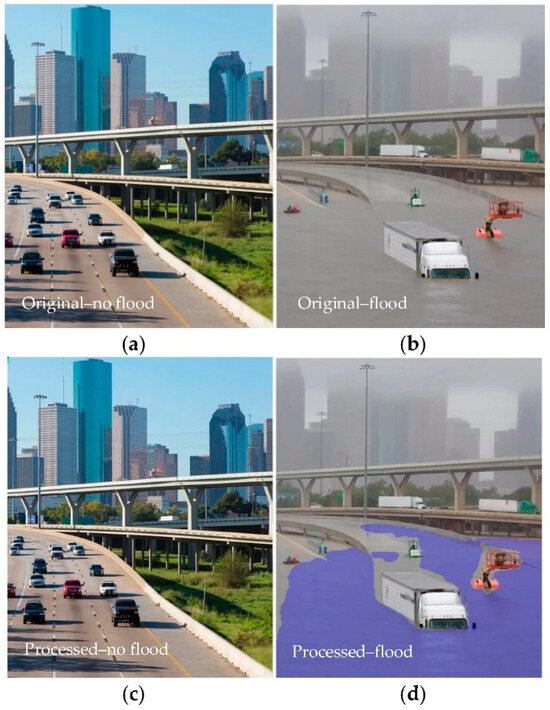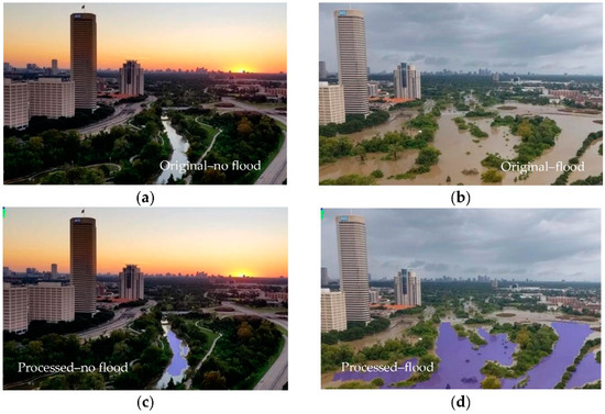 Comparison between the original images (a,b) and those obtained as the output to the flood detection algorithm (c,d). Water is marked with the blue layer overlaying the original images. Original images obtained ftom https://www.nbc4i.com/news/before-and-after-photos-illustrate-massive-houston-flooding/, accessed on 29 October 2023. Original image resolution: 72 dpi. Original image size: 864 × 486. (c) Accuracy: 94.1%; IoU = 86.1%; BF = 74.8%.; (d) Accuracy: 90.1%; IoU = 84.3%; BF = 69.2%.
