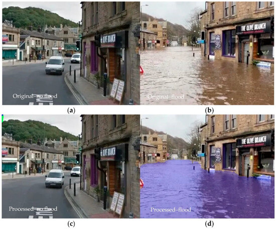 Comparison between the original images (a,b) and those obtained as the output to the flood detection algorithm (c,d). Water is marked with the blue layer overlaying the original images. for West End, Hebden Bridge, West Yorkshire. Images adapted from https://www.huffingtonpost.co.uk/entry/before-and-after-pictures-february-uk-floods_uk_5e539ebbc5b6b82aa655ab2, accessed on 29 October 2023. Original image resolution: 72 dpi. Original image size: 410 × 312. (d) Accuracy: 98.2%; IoU = 86.7%; BF = 77.4%.