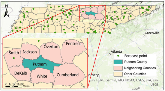 Despite the fast expansion of the AHPS, many small streams and areas do not have forecast stations. As of November 2021, there were 73 forecast points in the state of Tennessee that mostly covered the major rivers and urban areas. Out of the 95 counties in the state of Tennessee, 50 of them, including Putnam County, do not have any river forecast station [16]. Among the seven neighboring counties of Putnam County, only Smith County has a forecasting point (Figure 1). However, flooding remains an issue in several rural and suburban areas where there is no river forecast point.