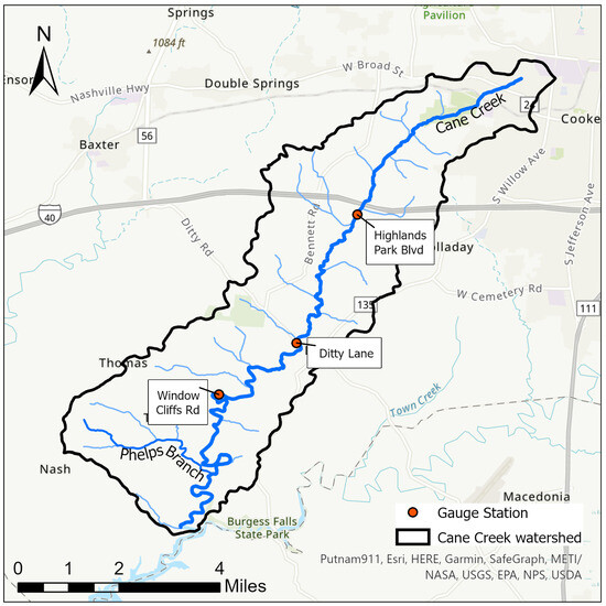 Window Cliffs is a 1.11 km2 (275-acre) recreational area located in the southwestern part of Putnam County, located in the state of Tennessee in the U.S. About 3.9 km (2.4 mi) stream length of Cane Creek flows through Window Cliffs. The recreational area also features a 2.7-mile trail that crosses Cane Creek 10 times [20]. Window Cliffs lies at the downstream section of the entire Cane Creek watershed (HUC-051301080703; Figure 2). The Phelps Branch is Cane Creek’s major tributary. The entire Cane Creek watershed is located in the Eastern Highland Rim in Tennessee. The watershed has a highly developed karst geology [20,21]. The Cane Creek watershed has a total area of 62.35 km2 (15,408.16 acres) oriented from northeast to southwest (Figure 2).