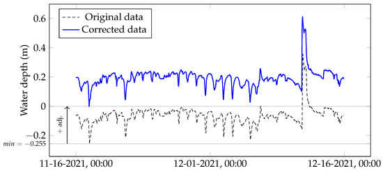 Correction of water depth data at Cane Creek crossing 1. The original values in C1-WD-TT were adjusted upwards with a constant value of 0.255 m (0.839 ft). Data shown in this figure are from 16 November 2021 to 15 December 2021.