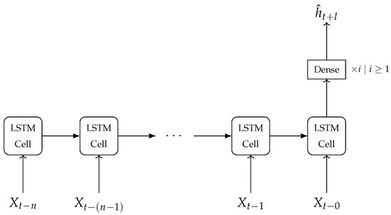 The LSTM Model 2 (LSTM 2) is made up of an encoder component and a decoder component. The encoder component has the same structure as the LSTM Model 1 (Figure 4). The output of the encoder section is passed onto the decoder section. The decoder component is a sequence of LSTM cells preceding at least one dense layer. We have named the LSTM cells in the decoder component as decoder cells to distinguish them from the LSTM cells in the encoder component. Each decoder cell uses the previous time step’s water depth at the target location and information from either the encoder component or a preceding decoder cell to generate the water depth at the next time step. This process is recursively repeated until the final water depth is generated.
