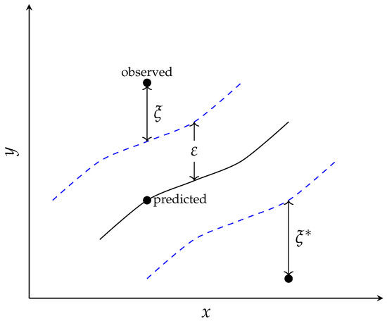The loss function for the SVR is an -insensitive loss [29] given by Equation (3):