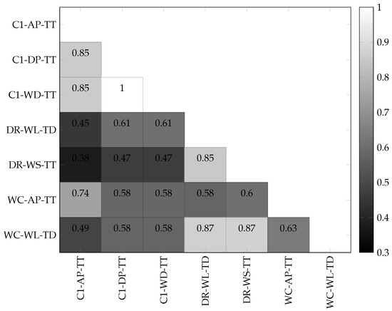 As indicated in Figure 7, there was a perfect positive association between C1-WD-TT and C1-DP-TT because C1-WD-TT is directly derived from C1-DP-TT. C1-WD-TT and C1-DP-TT both showed a strong correlation () with C1-AP-TT. C1-AP-TT and C1-DP-TT were therefore dropped from the set of selected input data. C1-WD-TT was maintained with the intuition that a historic water depth at C1 is likely a good factor in determining the future water depth at C1. WC-WL-TD, DR-WL-TD, and DR-WS-TT were maintained despite their strong cross-correlation () because they were recorded at different locations and with different recording systems unlike data from C1 which were all measured with one device and at the same location.