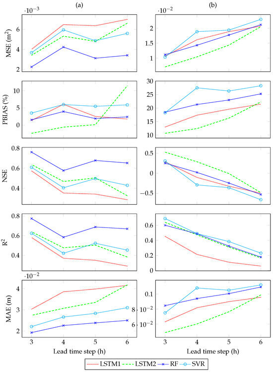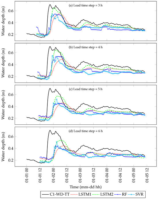 where refers to the predicted water level C1 at time step , l refers to the number of lead time steps, and referred to a sequence of input data from the present time, , to n timesteps in history. In this study, we assessed the lead time steps of 3, 4, 5, and 6 h for each of the candidate models.