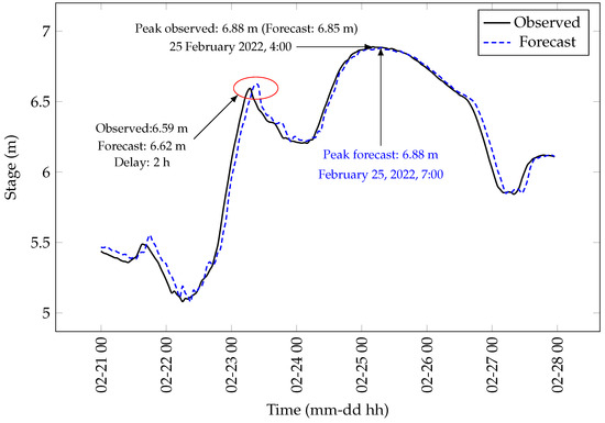 After the implementation of the various machine learning models on Window Cliffs, we followed the same methodology to test the LSTM 2 model on the Cumberland River at Ashland City, Tennessee, to ascertain the effect of data quantity on the performance of the forecasting system. Compared to Window Cliffs, the Cumberland river basin has a rich collection of gauge stations with longer periods of historic data. Data from 1 January 2019, 00:00 to 31 December 2021, 23:00 were used as training and testing datasets at the Cumberland River while the inference dataset covered the period from 1 January 2022, 00:00 to 4 June 2022, 01:00.