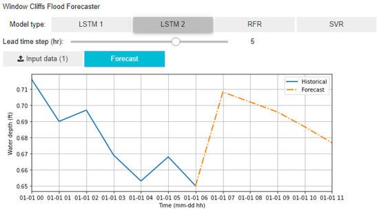 A platform for forecasting with the trained model was developed using Jupyter Notebook [37]. This platform assimilates data in a specific format to forecast water depth at C1. The ultimate goal of the flood forecasting system is to automate the entire forecasting process. This will involve the process of automatically fetching and preparing the input dataset before generating forecasts with the trained model. However, the automation process requires extra expertise beyond the scope of this study.