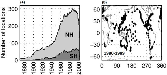 The number and distribution of tide gauge stations: (A) temporal distribution of the number of stations with sea level data in the northern hemisphere (NH) and southern hemisphere (SH), respectively, and (B) spatial distribution of tide gauge staions in the 1980s (Adapted with permission from [6]).