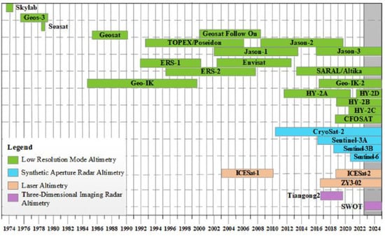 Temporal coverage of the satellite altimetry missions which include sea level observations. Gray column, for the period between July 2022 and December 2004, overlaps with the period after reference [7] was published, and obviously, it is just part of missions’ projections until the end of 2024 (Adapted with permission from [7]).